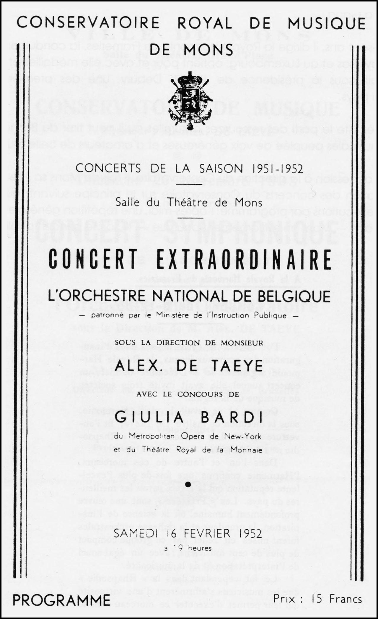 Lors de son dernier concert, le 16 février 1952, il conduit l’Orchestre National et accompagne Giulia Bardi, du Metropolitan Opera de New York ; il dirige le Tannhäuser ( De Taeye avait une admiration sans borne pour Wagner ). La grande salle de Mons est archicomble et le succès retentissant.